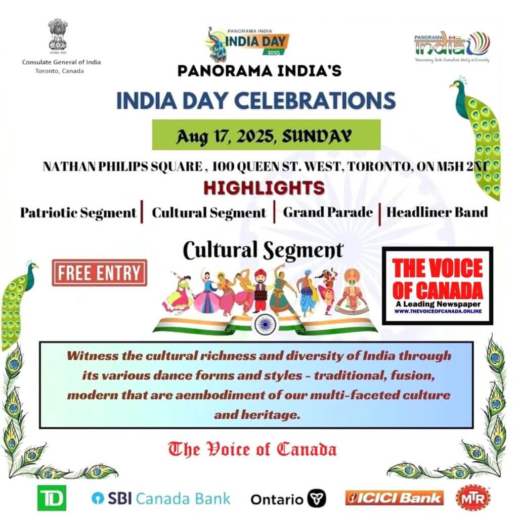 Toronto, ON – Panorama India, with the support of the Consulate General of India in Toronto, will proudly host India Day 2025 on Sunday, August 17, 2025, at Nathan Phillips Square, from 12:00 PM to 9:00 PM.